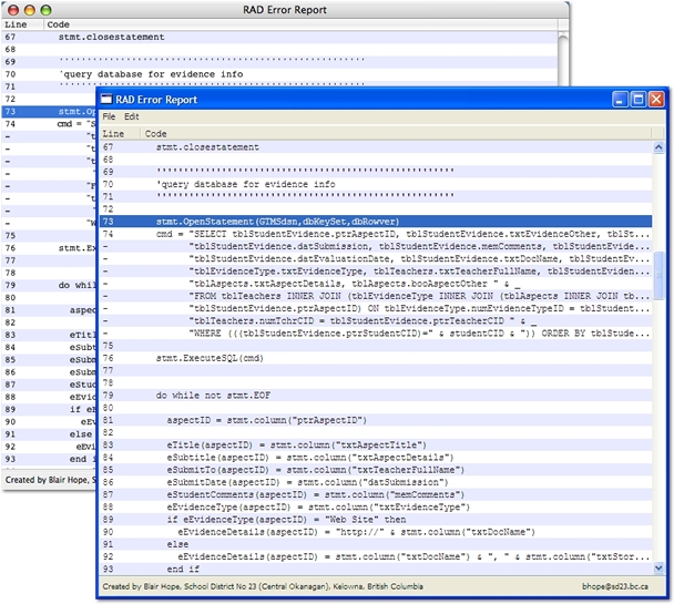 A quick utility to ease the pain when you are developing and encounter an error on line 223. Simply copy the source code, launch RAD Error Report and find the line quickly. Accounts for soft line breaks, freeware, Mac Universal Binary and Windows versions.